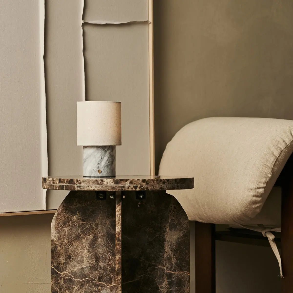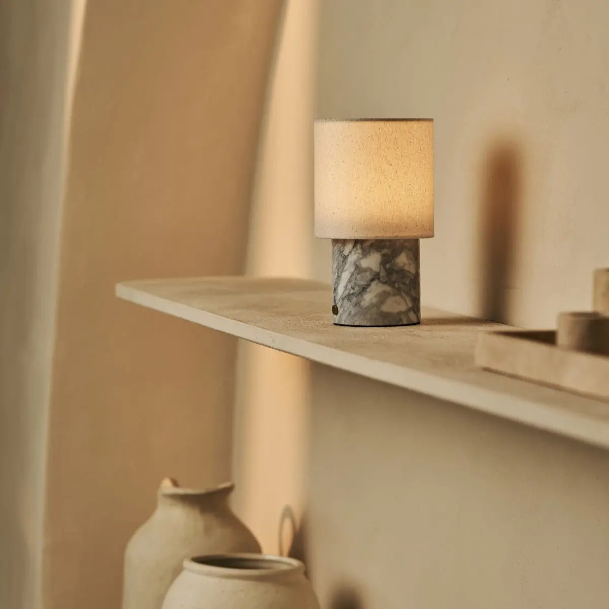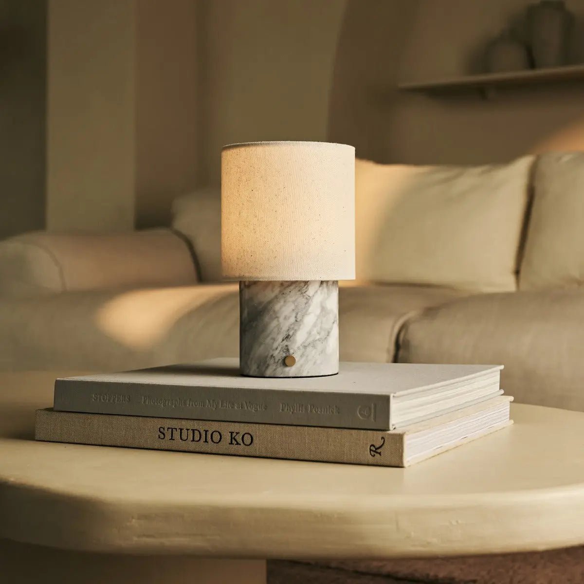 Dou White / Bianco Statuarietto – Marmeren oplaadbare tafellamp – Draadloos, 3 lichte modi en met linnen verwisselbare lampenkap