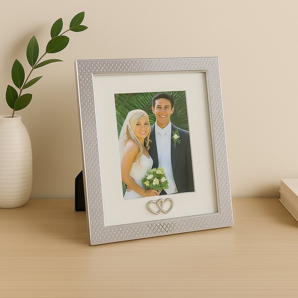 Ontdek de tijdloze verfijning van ons zilveren metalen frame, een echt decoratief juweeltje dat je meest waardevolle herinneringen verbetert. Met zijn strakke ontwerp en gouden afwerking brengt deze setting een vleugje verfijnde elegantie in uw interieur, hetzij modern of klassiek.