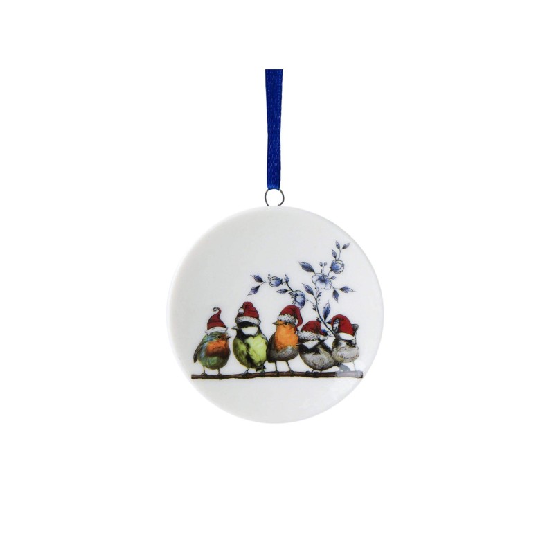 Een Kerstornament van een mini wandbord met vogels op tak met Kerstmuts
