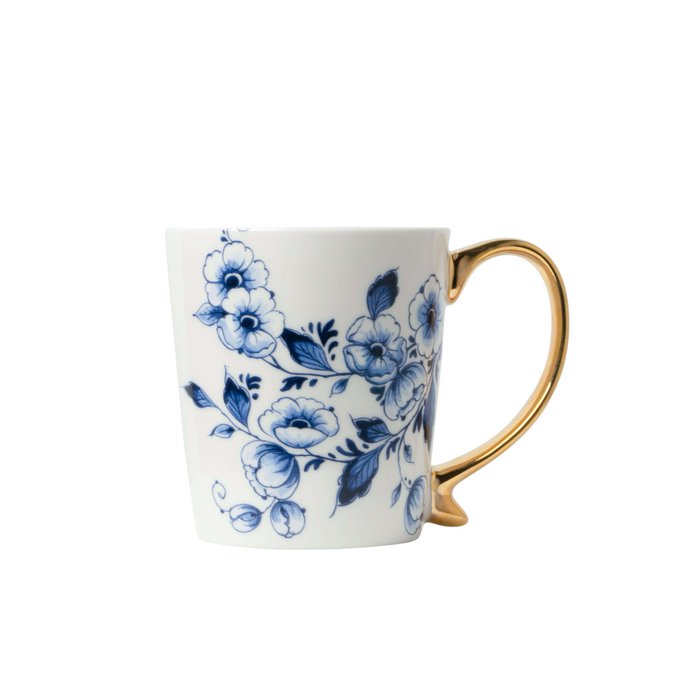Deze leuke mok is van keramiek en is gedecoreerd met een prachtige Delfts blauwe schildering en een gouden oortje. Bloemen en blaadjes zijn de meest traditionele decoratie op authentiek Delfts blauw. Het vergt jaren voordat een Delfts blauwe meesterschilder de techniek om deze typische bloemblaadjes te schilderen in de vingers heeft zitten. Voor deze gezellige mok hebben we er een iets modernere draai aan gegeven. De bloesem is weelderig, de lijnen van de mok modern en strak en het gouden oortje geeft de mok allure mee. Dit servies is NIET VAATWASSER-, MAGNETRON- EN OVENBESTENDIG