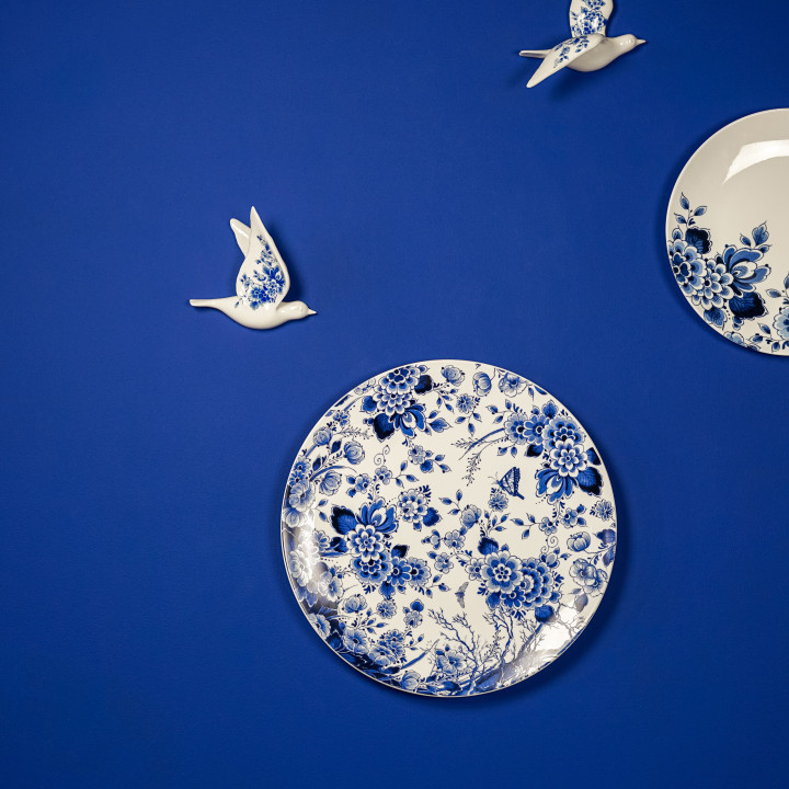 Een wit keramieken muurdecoratie van een vliegende vogel met Delfts Blauw print van bloemen De afmeting is 21 cm hoog, 17 cm breed en 9 cm diep Het gewicht is 227 gram