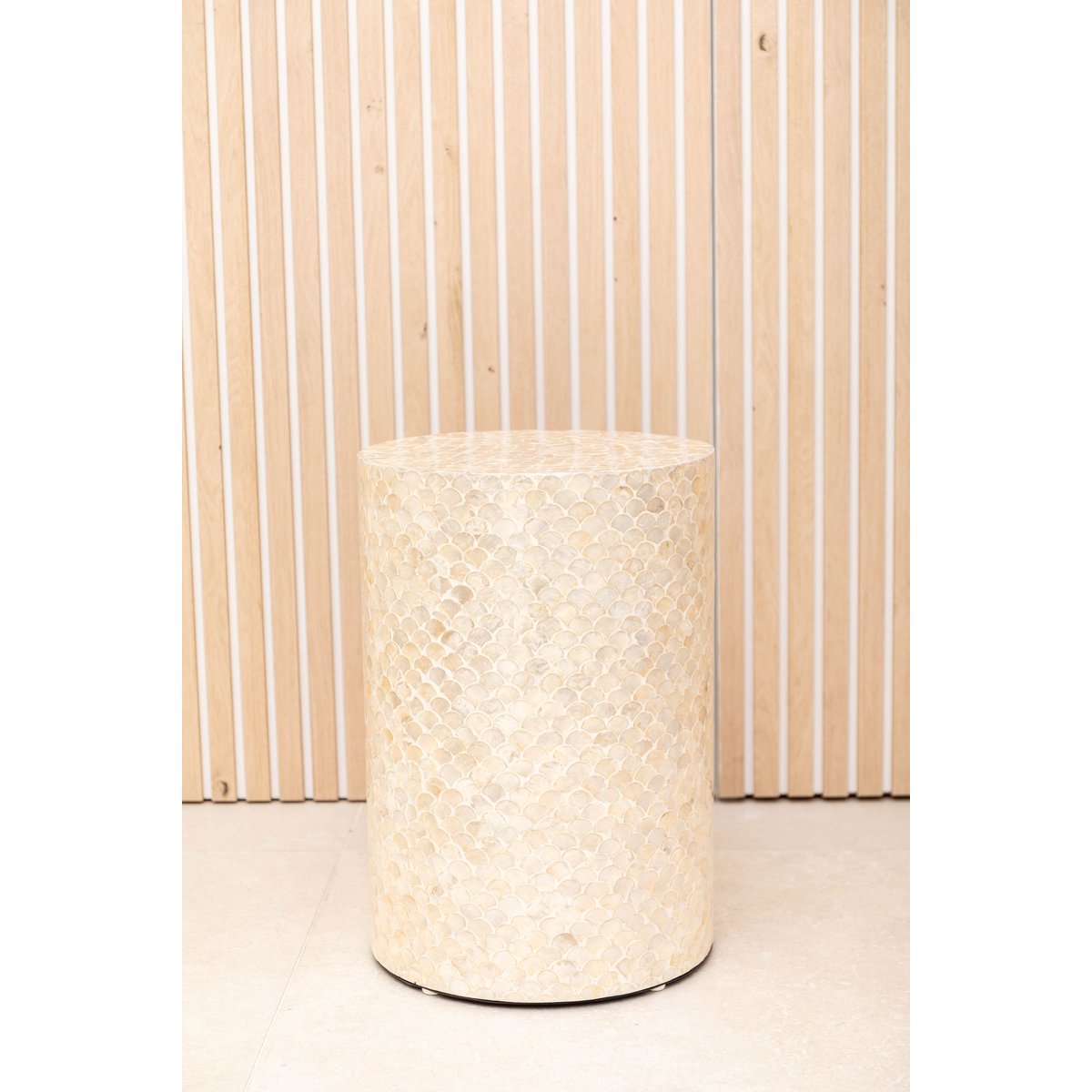 Deze parelwitte pouf is perfect voor het voltooien van een woonkamer, een slaapkamer of zelfs een ingang, het toevoegen van een vleugje luxueuze charme terwijl hij praktisch blijft.