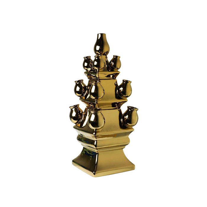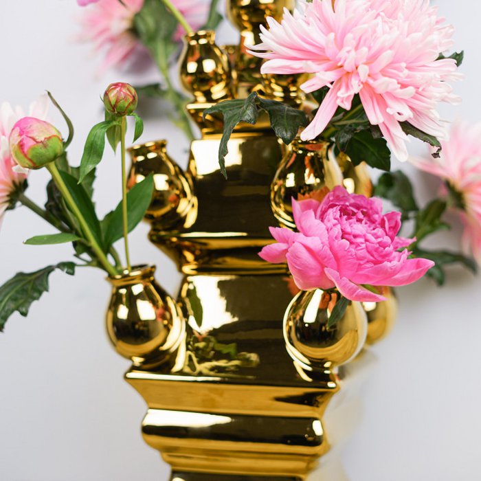 De driedelige tulpenvaas is misschien wel de meest imposante vaas uit de Nederlandse geschiedenis. Deze driedelige XL tulpenvaas is nog een slag groter dan zijn populaire voorganger en is met zijn formaat een nog indrukwekkendere verschijning. De vaas is van top tot teen gedoopt in goudverf waardoor hij een prachtige glans afgeeft. Dankzij de verschillende tuitjes wordt het enorm eenvoudig om een mooi boeket te schikken en door de aparte watercontainers krijgt elke bloem de voeding die het nodig heeft. Zo blijft je verse boeket langer mooi. Deze driedelige tulpenvaas kan niet gecombineerd worden met de losse elementen uit de Stapel gekte collectie, omdat hij dus een slag groter is.