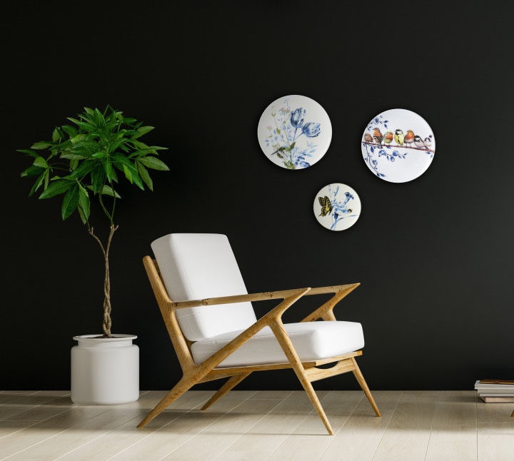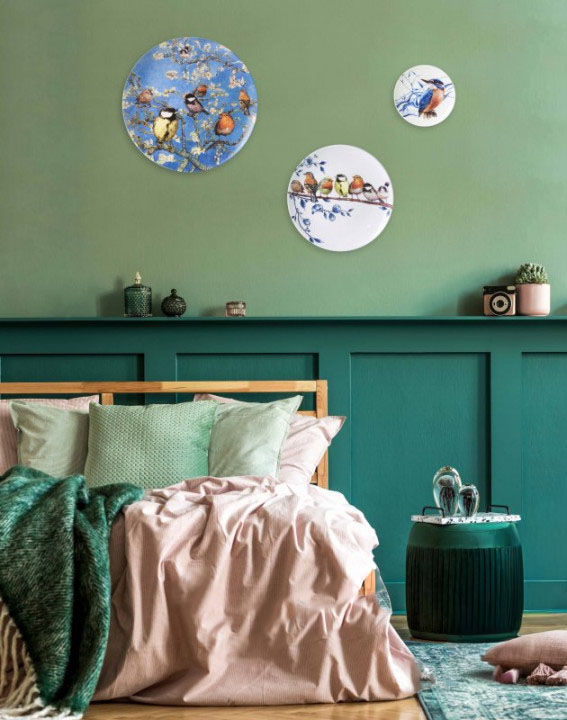 Een wit keramieken wandbord met multi kleuren en Delfts Blauw blauw print van bosvogels op een tak De afmeting is 26,5 cm diagonaal Het gewicht is 800 gram