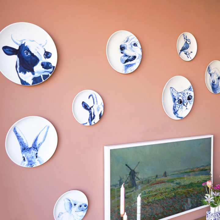 Heinen wandbord van wit keramiek met een afbeelding van een Geit in Delfts Blauw print. Het bord is 20 cm diagonaal en weegt 797 gram