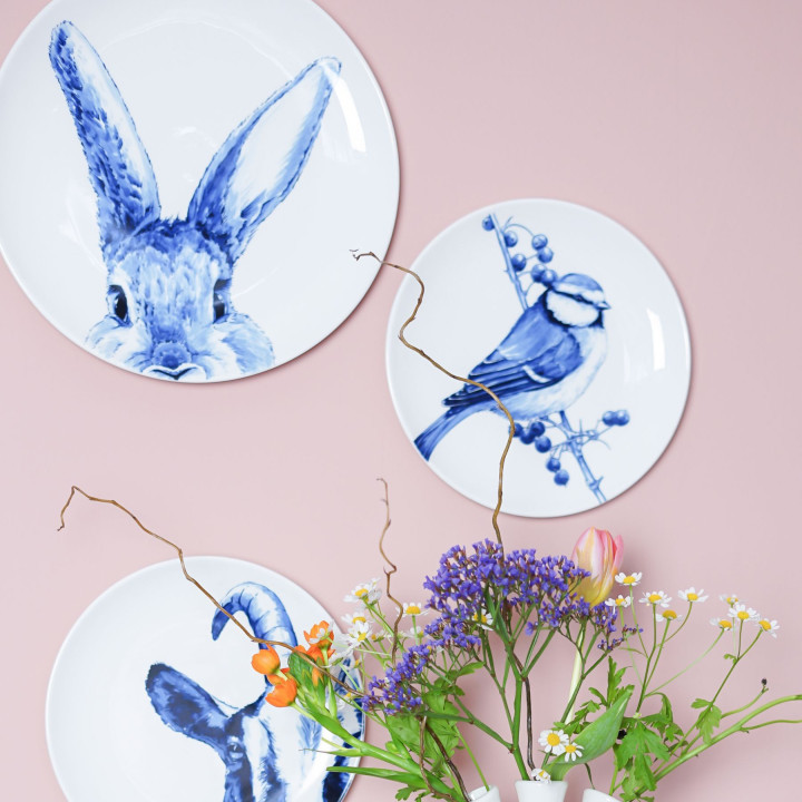 Heinen wandbord van wit keramiek met een afbeelding van een Haas in Delfts Blauw print. Het bord is 26,5 cm diagonaal en weegt 797 gram