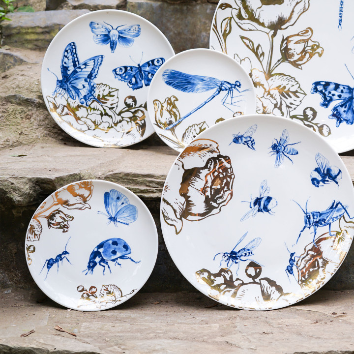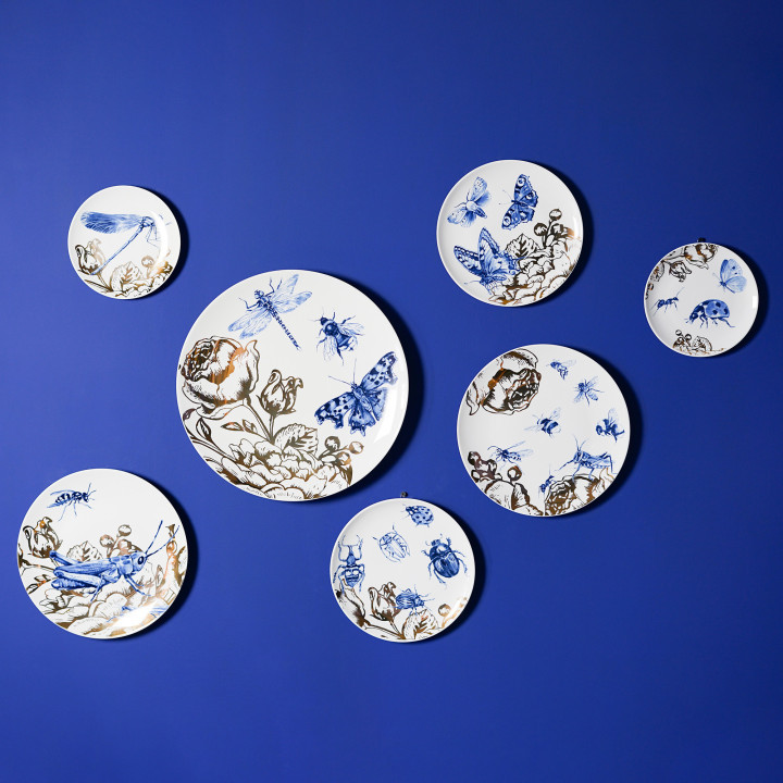 Heinen wandbord van wit keramiek met het thema Insecten en Lieveheersbeestje decor in Delfts Blauw en goud kleuren bloemmotief print. Het bord is 20 cm diagonaal en weegt 400 gram