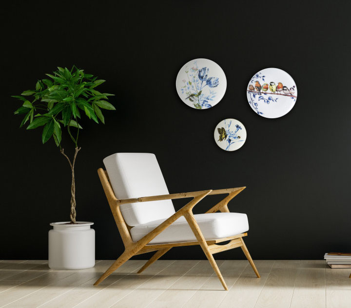 Een wit keramieken wandbord met blauw print van tulpen, kleurrijke bloemen en een “Libelle” De afmeting is 26,5 cm diagonaal Het gewicht is 800 gram